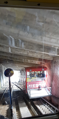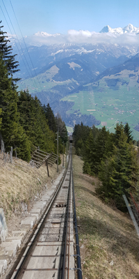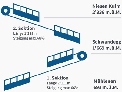 ด้วยความชันถึง 68% กับระยะทาง 3,399 เมตร แม้จะมีความชันถึง 68% แต่ทางเจ้าหน้าที่ก็รับประกันถึงความปลอดภัย เนื่องจากสายไฟสามารถที่จะรับแรงได้มากกว่า 8 เท่าของน้ำหนักจริงที่โหลดตามที่ระบุและระบบเบรคอัตโนมัติที่สามารถที่จะหยุดภายใน 1 เมตรเมื่อเกิดเหตุการฉุกเฉินทำให้ผู้เยี่ยมชมมั่นใจว่าการเดินทางครั้งนี้ปลอดภัยแน่นอน ซึ่งการเดินทางด้วยรถกระเช้าไฟฟ้านี้จะมีจุดเปลี่ยนสถานีตรงกลางคือที่ Schwandegg
